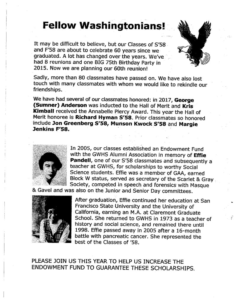 George passed away in his on August 5th, 2020 in Rossmoor (Walnut Creek), California. George was in the class of Fall ’58. He was an Eagle, on the Public Address Crew, AFS, FAC, French Club, and participated in Junior and Senior Day.