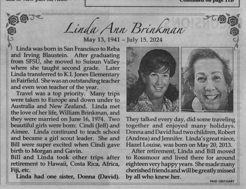 Bonny is survived by her husband Dave, her sons Scott (Grace) and Bruce (Tracey), her brother Ted (Diane), and grandsons Matthew, Zachary, and Kyle. Donations in her memory can be made to the Alzheimer’s Association or the Sunnyvale Presbyterian Church. A celebration of life will be held later.